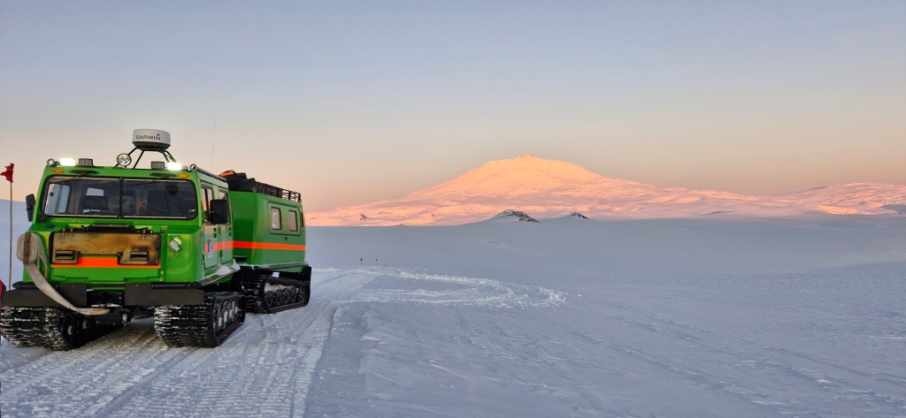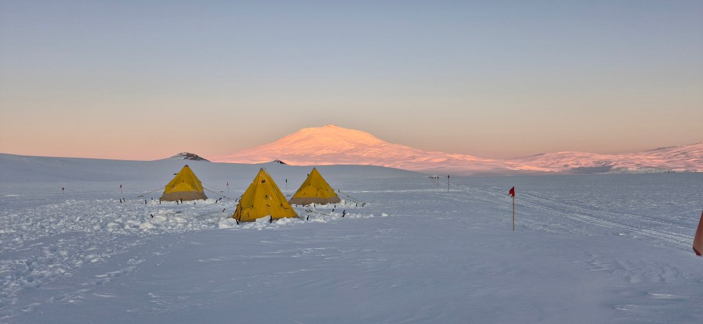 We packed our gear into a real life Hagglund (!!) and drove out to a quiet camp under the prominent landmark of Mount Erebus. We started with setting up the two tents that we slept in, yellow polar pyramid ones that are surprisingly easy to stand up once you dig some holes for the poles to nestle into. There was another tent already there which was the ‘ablutions block’.