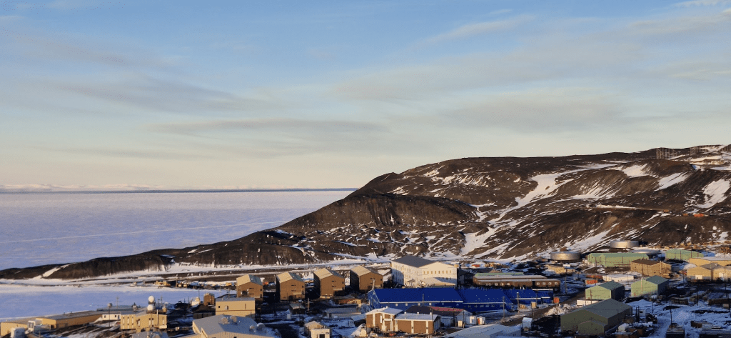 In the next image below, you can see McMurdo Station in the foreground, part of Ross Island in the mid-ground (is that a word?), and along the horizon is a skinny strip of open water. There have been issues with some of the science projects here due to the amount of open water already, where they were expected to deploy and set up camp on the sea ice that should be there instead.