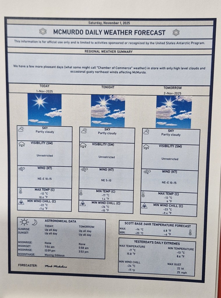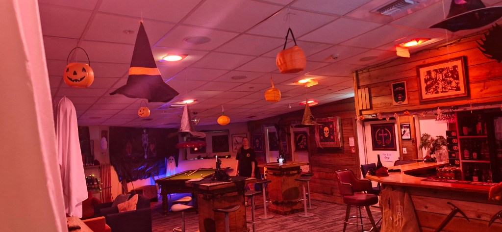 The bar was transformed incredibly well into a Halloween theme last night for the Halloween party. There was a black and white moving playing on the TV in the background, and decor along every wall and across the ceiling. Even decor out the front door, and a rack of costumes to choose from so there was no excuse to arrive without an outfit! I enjoyed talking to the chefs and learning about their previous experiences, how they are liking the time at Scott Base at the moment, and more travel plans for the future.