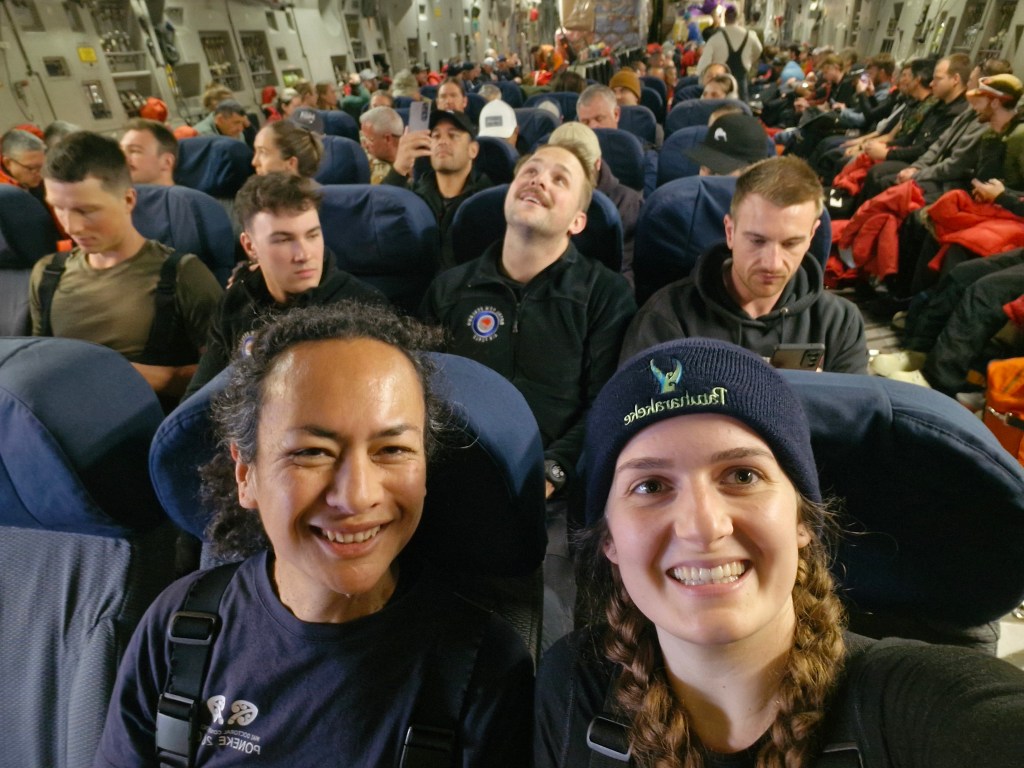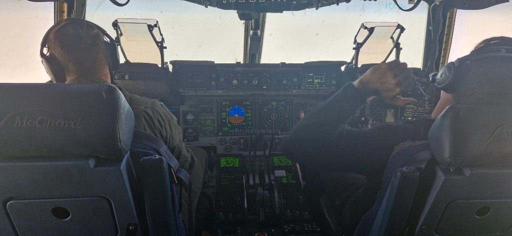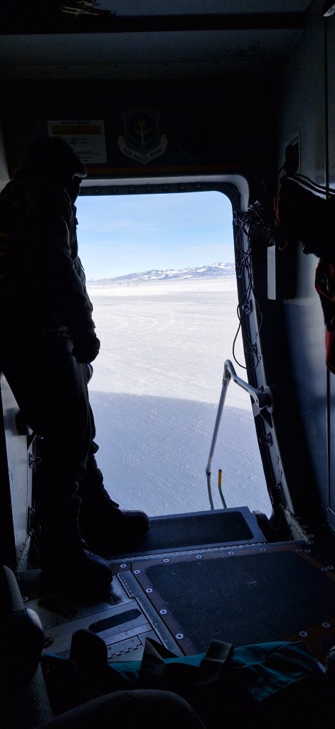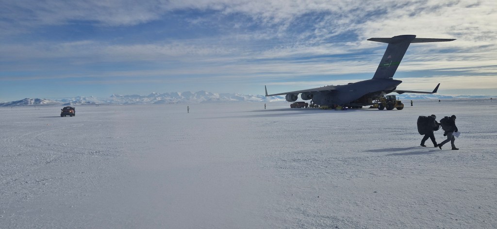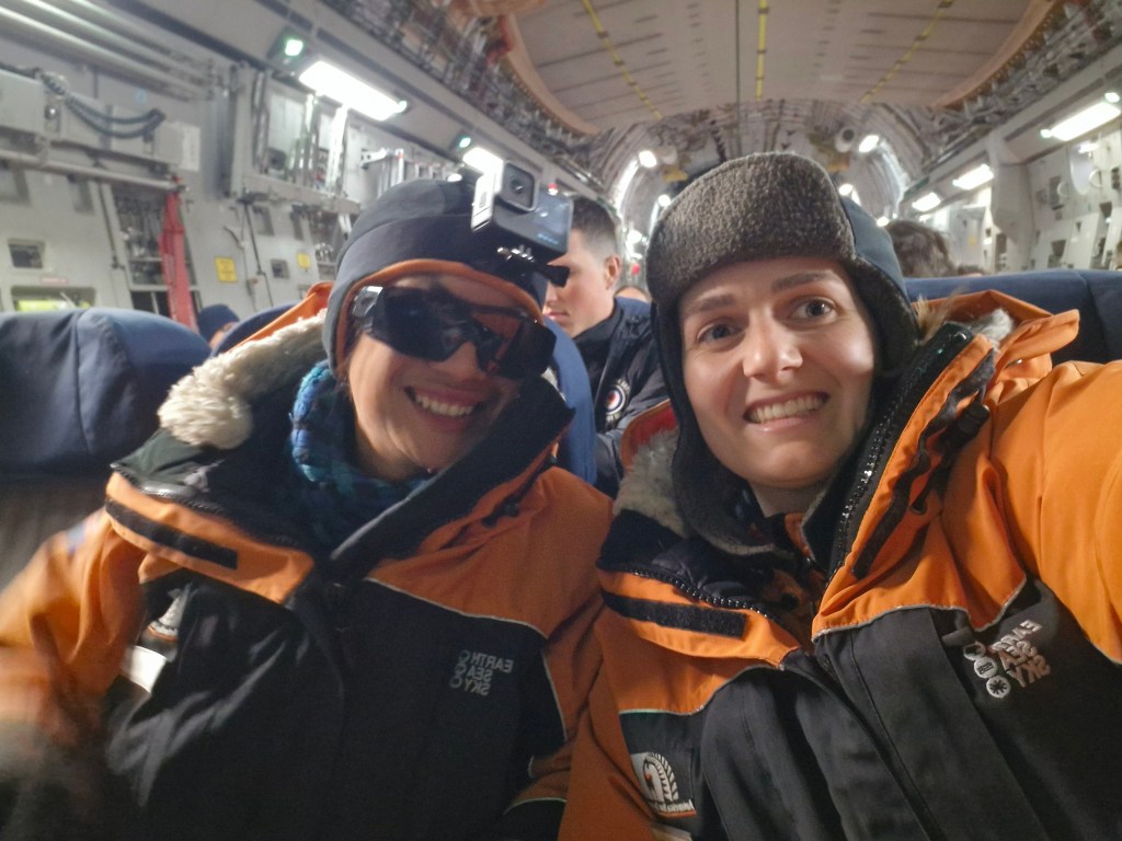 Even after one day, I’m losing track of all the things to share! We arrived at the Antarctica passenger terminal early in the morning, checked in our baggage and had the first briefing. We then put on some of our ice gear and jumped in a bus to take us to board the C17 military plane operated by the US Air Force. The flight was 5 hours long, and my supervisor Ocean and I were at the very front of the plane! We had a great view from out the front left door before it closed in Christchurch and then again when it first opened in Antarctica. The landing was surprisingly smooth given they were expecting a bit of slip-and-sliding after the big snowstorms last week.
