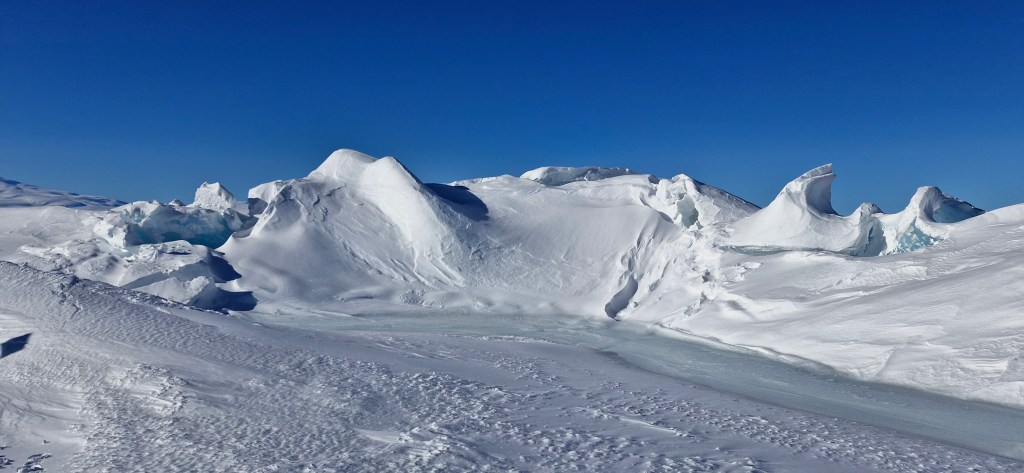 Yesterday we went for a walk around the pressure ridges, which are raised ice formations caused by the sea ice pushing up against the land, not dissimilar to tectonic plates. This often causes small gaps which seals can come up through from the ocean onto the ice, or thinner areas of ice which the seals chew through with their teeth. It is the beginning of birthing season at the moment, so we encountered some new pups too! The rules are that you must pass animals with at least 10m distance, but if you stop that far away, they can approach you without you having to move back. Sadly no seals wanted to see us close up today.